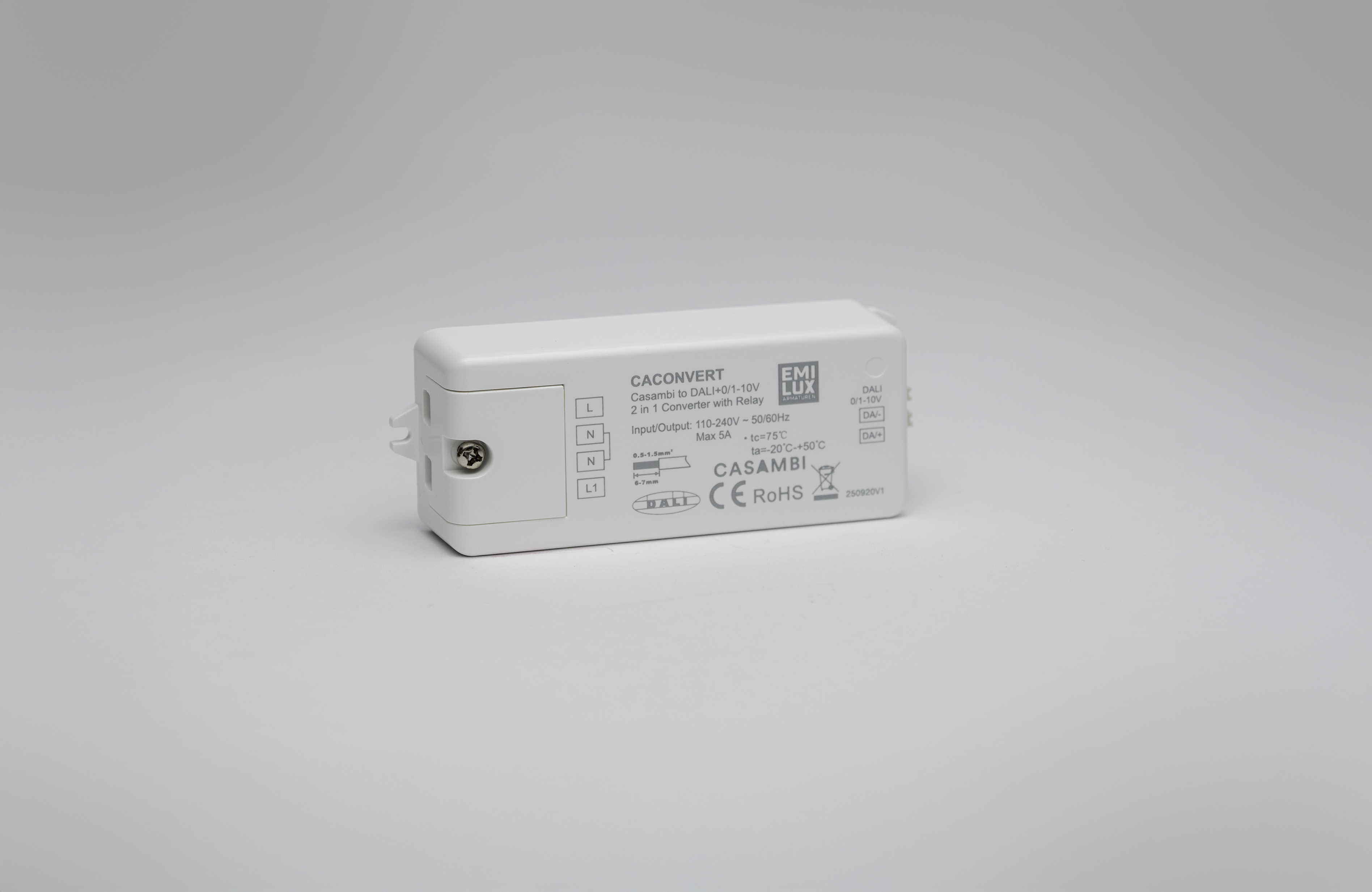 Casambi converter DALI + 1-10V bediening. DALI DT6, DT8 TW, DT8 XY, DT8 RGBW, 0-10V. Relais 5A. DALI bus 50mA (tot 25 armaturen), 0-10V 20nA. Afm 91x37x20mm