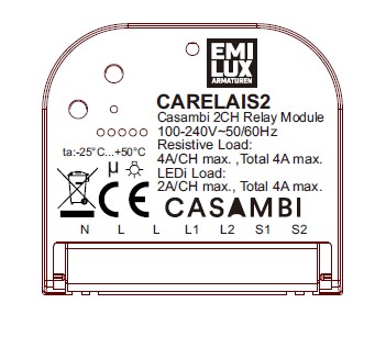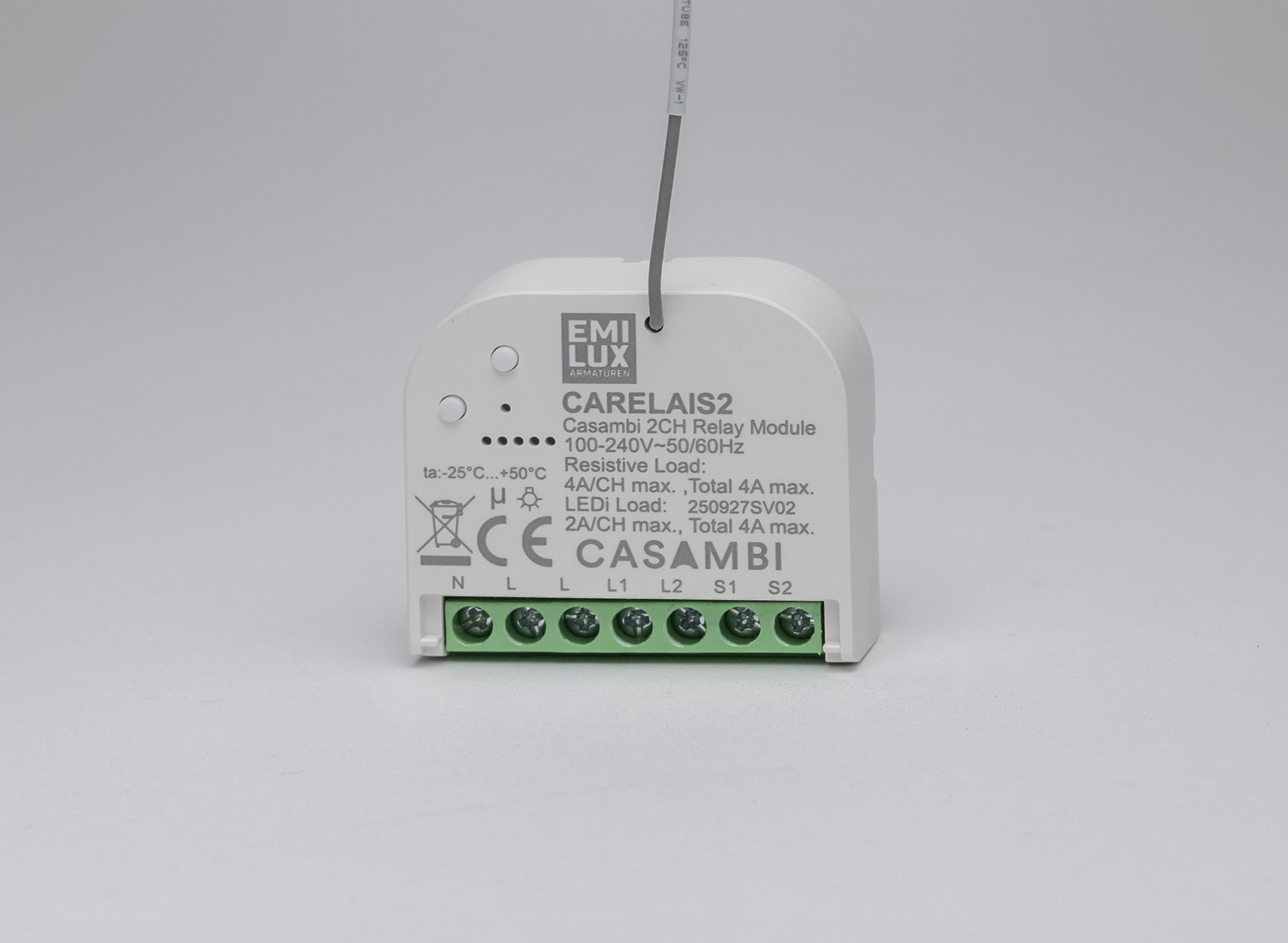 Casambi actor, 2-voudig Relas. Bedienbaar middels Puls schakelaar (2 stuks) of Casambi. Kan achter schakelaar (past in inbouwdoos). Kan tevens los geplaatst worden of in de meterkast dankzij los leverbare trekonlasting (CACLAMP) en DIN-rail bevestiging (CADINR). 2x 2A Maximaal 2x 150W LED vermogen. afm. 42x38x16mm.